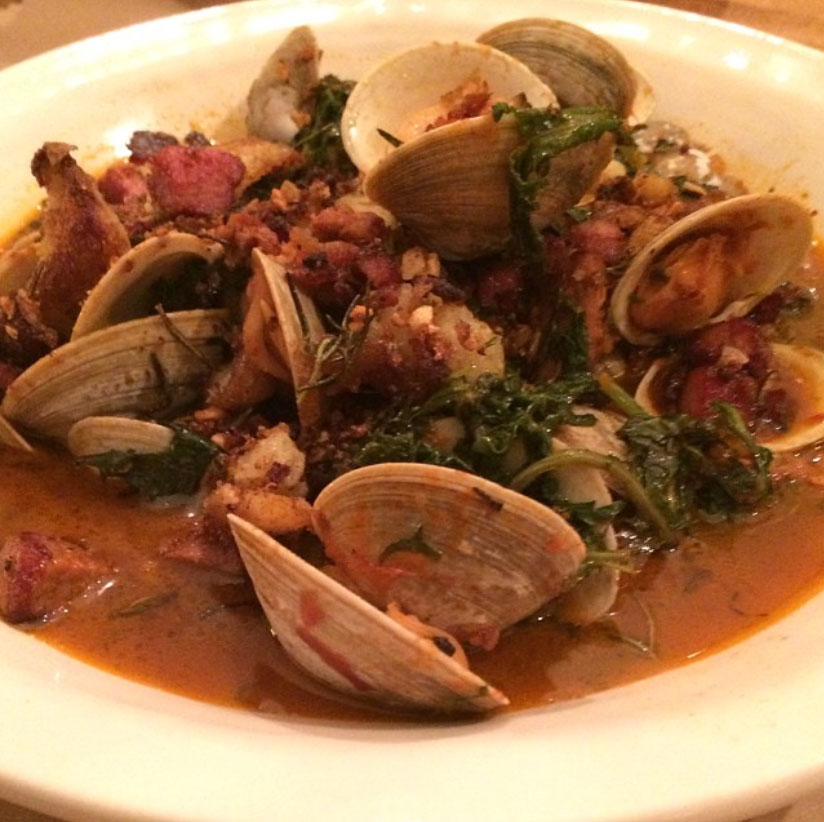 Phoebe writes, "Narragansett Bay littlenecks + fried potatoes + pork confit + kale = dinner."